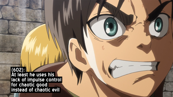 This is a roleplay journal for a fan AU version of Eren Jaeger from Attack on Titan. Played by [personal profile] rainraven. Primary difference from canon is different worldbuilding for the outside, causing a dramatic divergence beginning at the basement. Eren himself is capable of seeing things in shades of gray instead of reducing everything to a black and white binary, and beneath his anger really is the sweet guy his friends always believed him to be.